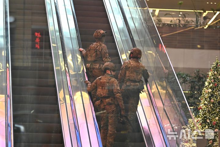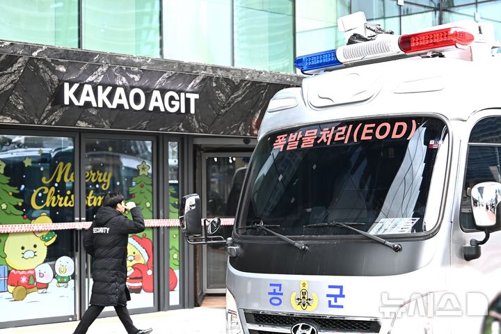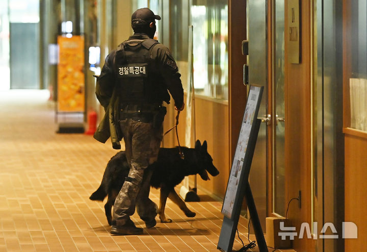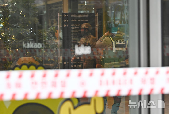 【NEWSIS】京畿道城南市盆唐区の「カカオ板橋アジト」にビル爆破の脅迫が行われた15日、警察が捜索を行っている様子。
