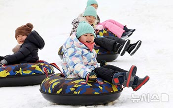 【NEWSIS】23日、ソウル市蘆原区のソウル科学技術大学総合運動場に、「2025蘆原シンシンそり場」がオープンした。写真はそりに乗って楽しいひとときを過ごす近くの保育園の園児たち。
