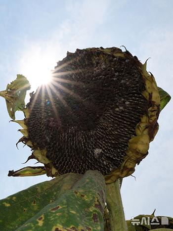 【NEWSIS】連日の猛暑が続いている31日午後、仁川市延寿区松島のある菜園近くに咲いたヒマワリが、あまりの暑さでしおれている様子。