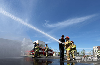 【NEWSIS】22日、大邱市東区の大邱消防教育安全センターで開かれた「韓国119青少年団中等キャンプ」に参加した児童が、防火服を着て放水体験をしているところ。
