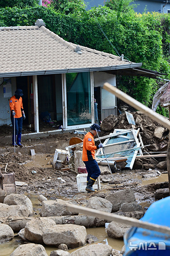 【NEWSIS】先日の韓国の記録的な豪雨で土砂崩れが発生し、1人が行方不明になっている慶尚南道山清郡の村で、行方不明者の捜索に当たる消防隊員たち。