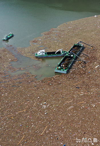 【NEWSIS】23日午前、八堂ダム(京畿道南揚州市)の水面で、ダム湖に流れ込んだゴミや浮遊物の処理作業を行っている関係者の様子。