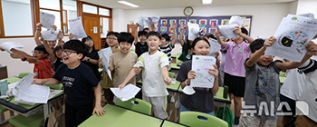 【NEWSIS】ソウル市銅雀区のソウル三一小学校で23日、4年3組の児童が1学期の終業式を迎え、夏休みの計画書を持ってみせている様子。