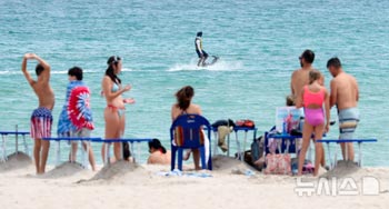 【NEWSIS】済州島内の海水浴場の早期オープンが間近に迫った23日午前、済州市朝天邑の咸徳海水浴場を訪れた観光客が、海風に当たって暑さを紛らわせている様子。