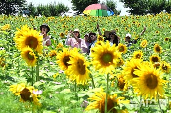 【NEWSIS】梅雨が小康状態を迎えた23日、京畿道安城市の安城ファームランドを訪れた市民が、大きく開花したヒマワリの花畑で思い出作りをしている様子。