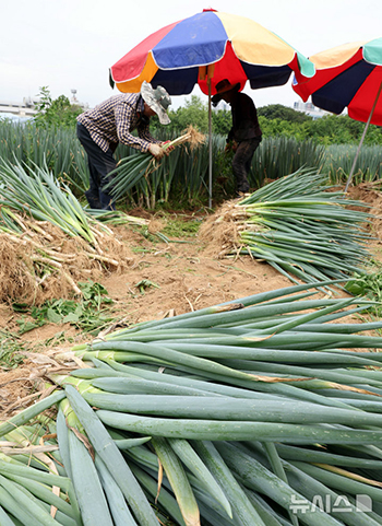 【NEWSIS】24日午前、仁川市南洞区のネギ農場では猛暑の中、梅雨時の集中豪雨に備えて従業員がネギの収穫を行っていた。