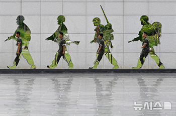 【NEWSIS】韓国戦争(朝鮮戦争)発生から75年となる前日の24日、京畿道烏山市の竹美嶺平和公園を訪れた韓国陸軍第51師団の兵士たち。国連軍スミス特殊任務隊の行軍の様子を表現したオブジェの近くを歩..