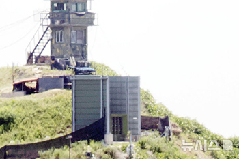 【NEWSIS】対北拡声器放送が中止された12日、京畿道坡州市の接境地域から遠望した韓国軍の哨所前に見える対北拡声器の様子。