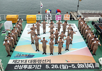 【NEWSIS】第21代韓国大統領選挙まであと2週間ほどとなった21日、釜山市中区の釜山港湾公社ふ頭に停泊中の韓国海洋水産研修院実習船「韓半島号」(5255トン)で、釜山海事高校の生徒たちが起票の様..