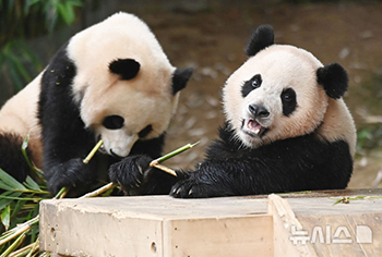 【NEWSIS】「国際生物多様性の日」に当たる22日、エバーランドのパンダワールド(京畿道竜仁市)にある屋内飼育場で、韓国初の双子パンダ「ルイバオ(睿宝)」と「フイバオ(輝宝)」が木登りをして楽しい..