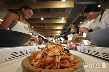 【NEWSIS】米ジョージア大学の学生たちが22日午前、食品大手「セムピョ」の「ウリマッ(私たちの味)空間」(ソウル市中区)で開かれた韓食クッキングクラスで韓食を調理している様子。