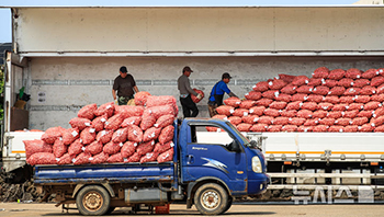 【NEWSIS】26日午前、済州島西帰浦市の大静流通センターで、今年初のニンニクの買い上げが行われている様子。