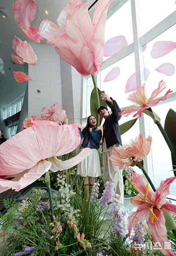 【NEWSIS】20日、ロッテワールドタワー展望台「ソウル・スカイ」(ソウル市松坡区)のフラワー体験型空間「Blooming Universe:ビッグフラワー」でポーズを取るコンパニオンの様子。 1..
