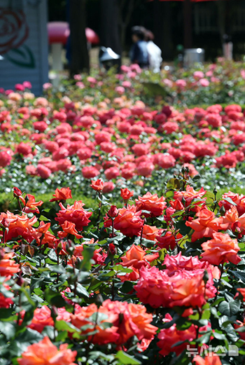 【NEWSIS】20日、釜山市機張郡のウィッコル公園を訪れて大きく咲いたバラの花を眺めている市民の様子。この公園には77種類のバラ、合わせて3万株が植栽されている。