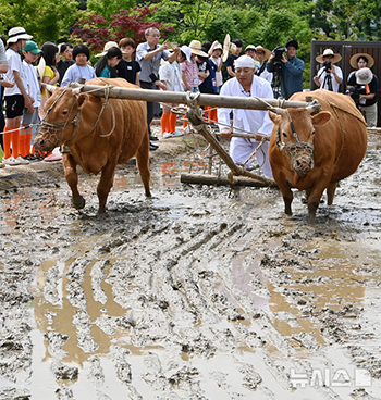 【NEWSIS】二十四節季の一つ「小満」に当たる21日、京畿道水原市の国立農業博物館の棚田で、牛耕用の犂(すき、ギョリ)を用いた「ギョリ農耕文化試演および素手田植え」イベントが開かれ、洪川ギョリ農耕..