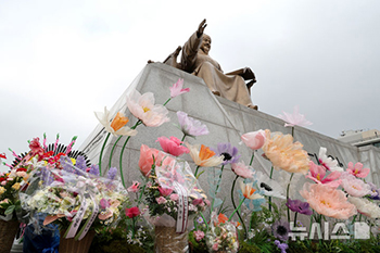 【NEWSIS】世宗大王の生誕日にあたる15日、光化門広場(ソウル市鍾路区)にある世宗大王像は、生誕日を祝う花で取り囲まれていた。