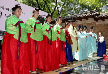 【NEWSIS】「成年の日」前日の19日、ソウル市中区の徳寿宮石垣道で、第53回ソウル市「成年の日」祝祭が行われた。写真は伝統的な儀式「成年礼」を再現する若者たち。