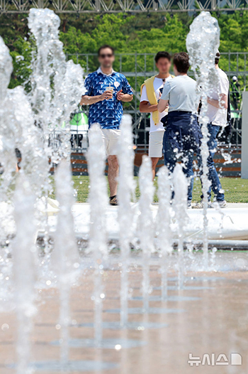 【NEWSIS】ソウルの昼間の気温が24度まで上昇し、初夏の天気となった12日、ソウル市中区のソウル広場で地面の噴水を眺めている外国人の様子。