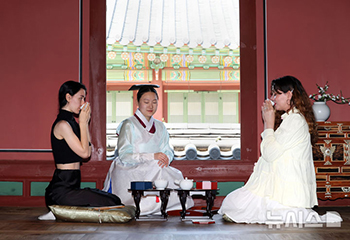 12日、ソウル市鍾路区の昌徳宮薬房で開かれた2025年「昌徳宮薬茶房」事前イベントで、伝統の茶菓子と韓国漢方茶を味わう外国人の様子。 国家遺産庁は国家遺産振興院と共同で、6月4日から6月26日まで一..