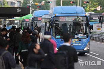 【NEWSIS】会社側との賃金・団体協約交渉が決裂したソウル市内バス労働組合は「順法闘争」を二日間にわたり続けている。写真は8日、ソウル駅前のソウル駅前バスロータリーにある停留所で、バスを待つ乗客た..