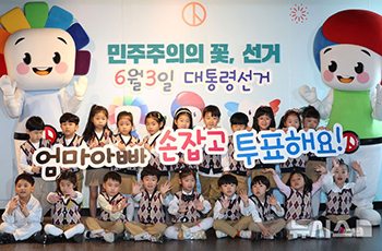 【NEWSIS】第21代韓国大統領選挙まであと26日と迫った8日午前、仁川市弥鄒忽区の仁川市選挙管理委員会投票体験場で、子どもたちが大統領選の選挙日PRを行っている様子。