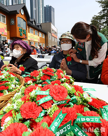 【NEWSIS】「父母の日」に当たる8日、ソウル市東大門区の「多一共同体 ご飯をよそって分かち合う運動本部」前の広場では「父母の日 孝道の宴」が開かれ、ボランティアがお年寄りにカーネーションを付けてあ..