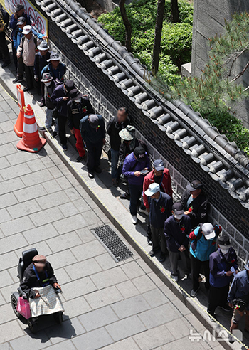 【NEWSIS】「父母の日」に当たる8日、ソウル市鍾路区の圓覚社無料給食所を訪れた高齢者が列を作って待っている様子。