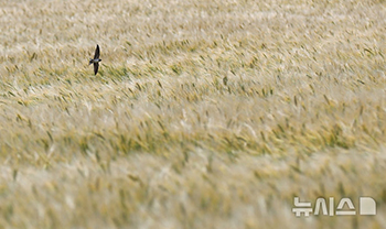 【NEWSIS】晴天となった8日午後、済州市内都洞で、黄色く染まっていく麦畑の上を滑空するツバメたち。