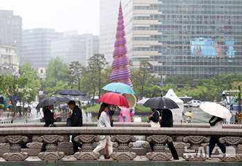 【NEWSIS】韓国各地で雨となった9日、傘をさしてソウル・清渓川近くを歩く市民の様子。