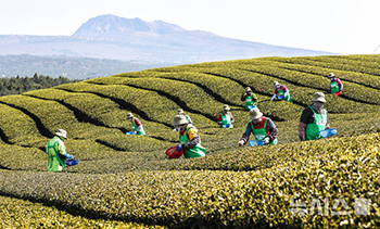【NEWSIS】8日午前、済州特別自治道西帰浦市内のトルソンイ茶畑で、「ヘチャ」というお茶の葉を摘む人々。 ヘチャは二十四節気の第5節気「清明」以降、晴れた日だけに新茶を1枚1枚、手で摘んで作られる..