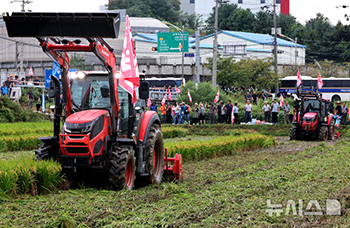 【NEWSIS】全国農民会総連盟のメンバーが12日、京畿道安城市薇陽面の水田で「米価保障・コメ輸入阻止・糧穀管理法改正案貫徹のための水田掘り起こし闘争」集会を開き、水田をトラクターで掘り起こしている様..