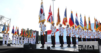 【NEWSIS】11日午前、仁川市中区の仁川内港1・8埠頭(ふとう)で開かれた仁川上陸作戦74周年戦勝記念式典で、韓国の国旗と6・25戦争参戦22カ国の国旗を持っている旗手団の様子。