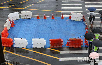 【NEWSIS】12日午前、ソウル市東大門区のソウル地下鉄6号線・高麗大駅近くの様子。陥没した道路が通行禁止となっている。 この前日の11日夜10時ごろ、シンクホール(地下の空洞化による穴)と推定さ..