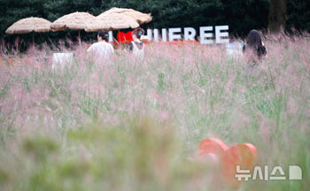 秋夕(チュソク=中秋節、今年は9月17日)連休を控えた12日午前、済州道西帰浦市南元邑の休愛里自然生活公園を訪れた人たちが、本格的な秋を前に見ごろを迎えたピンク色のススキ「ミューレンベルギア・カピラ..