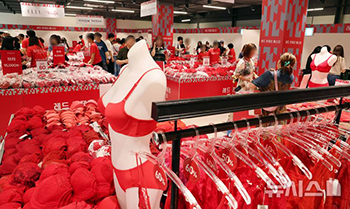 【NEWSIS】12日、大規模な拡張と改装を終えて新たにオープンした新世界サイモン釜山プレミアムアウトレット(釜山市機張郡)で、赤い下着を購入する人々の様子。 新世界サイモン釜山では、空間・ブランド..