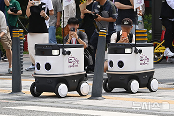 【NEWSIS】京畿道城南市の板橋駅広場近くで9日、城南型ロボット配達サービスの試演会が行われている様子。 城南市は、韓国企業の「ニュービリティ」と共に今月12日まで、屋外自立走行ロボット6台を板橋..