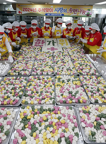 秋夕(チュソク=中秋節、今年は9月17日)を控え、釜山市釜山鎮区の大韓赤十字社釜山支社希望分かち合い奉仕センターで10日、ボランティアメンバーたちが恵まれない隣人たちに配る松餅(ソンピョン)をつくっ..