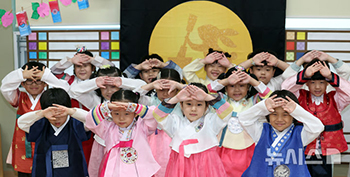 【NEWSIS】秋夕(中秋節。今年は9月17日)が迫った10日、釜山市釜山鎮区庁のオリニチプ(民間保育施設)では、園児たちが韓服(韓国の伝統衣装)をきれいに身に着け、茶礼(先祖供養の儀式)でクンジョル..