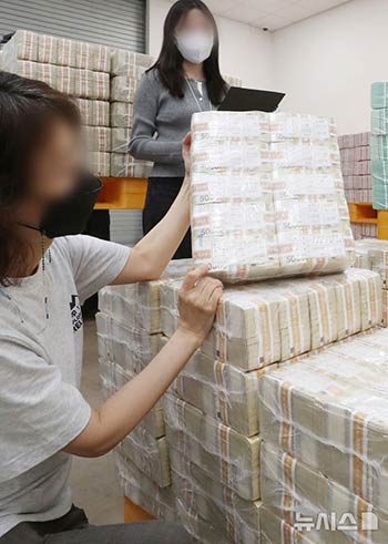 【NEWSIS】秋夕(中秋節。今年は9月17日)まであと1週間と迫った10日、韓国銀行京畿本部(京畿道水原市霊通区)の現送作業場では、行員が市中の銀行に供給される秋夕資金を点検していた。(共同取材)