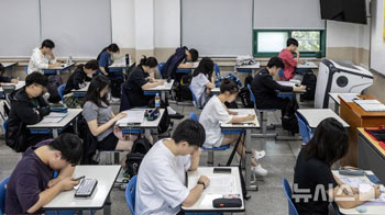 2025年度大学修学能力試験の模擬試験が行われた4日午前、ソウル市陽川区の新木高校で生徒たちが試験の準備をしている様子(写真=共同取材団)。