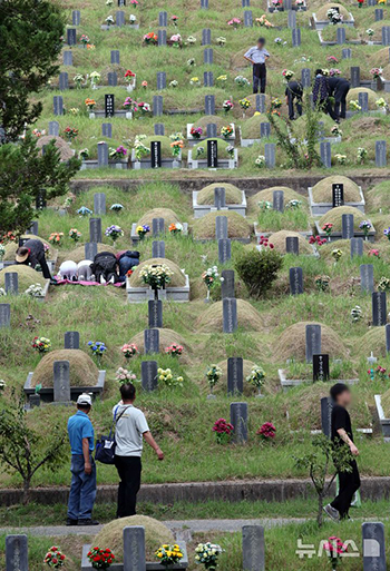 【NEWSIS】秋夕(チュソク=中秋節、今年は9月17日)連休まであと約1週間になった8日、釜山市金井区の公園墓地「永楽公園」を訪れた家族連れ。周辺の草刈りや先祖の墓参りをした。