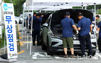 【NEWSIS】1日、ソウル市城北区庁近くで行われた「秋夕(チュソク=中秋節)帰省の車 無償点検サービス」で、車の点検をしてもらう人々。今年の秋夕は9月17日で、その前後が連休になる。◆猛暑特別警報..