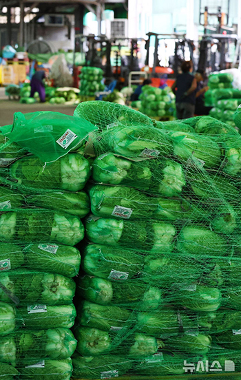 【NEWSIS】猛暑などでハクサイの価格も高騰している。写真は2日、ソウル市松坡区の可楽農水産物総合卸売市場に積み上げられたハクサイ。◆猛暑特別警報解除 さわやかな秋の訪れ /ソウル◆9月1日から景..