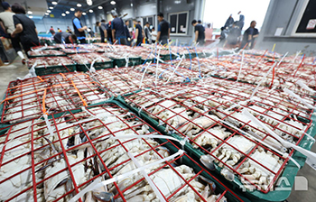 禁漁期間が解除され、秋のワタリガニが本格的に出荷されている中、仁川市中区の京仁西部水産協同組合委託販売場で2日午前、ワタリガニの競りが行われている様子。◆ハクサイが高騰 /ソウル◆猛暑特別警報解除 ..