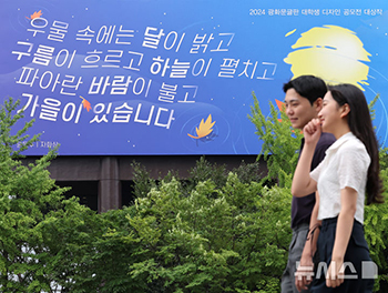 【NEWSIS】2日午前、教保ビルディング(ソウル市鍾路区)外壁の「光化門掲示板」には、詩人・尹東柱の詩「自画像」の一節が記されていた。これは2024光化門掲示板大学生デザイン公募展で大賞を取ったホン..