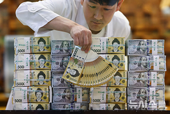 ソウル市中区のハナ銀行偽変造対応センターで20日、行員がウォン紙幣を手にしている様子。 米国経済が低迷を避けるだろうとの見方が広がっている中、19日(現地時間)にドルが今年1月以来7カ月ぶり安値に下..