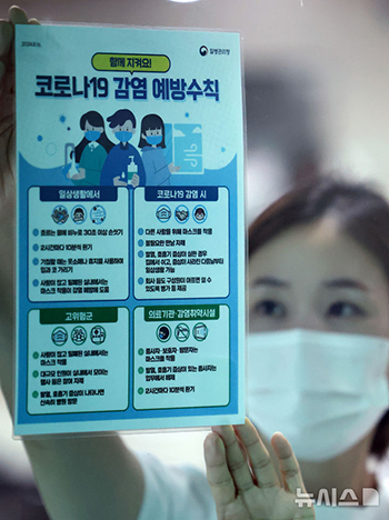 【NEWSIS】新型コロナ患者が増える中、20日に大邱市達西区保健所では、感染病対応チームの職員が新型コロナ感染予防守則に関する広報物を張り出していた。◆【写真】猛暑により洛東江でアオコ発生◆【写真】..
