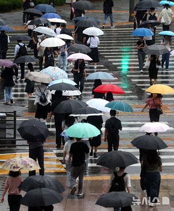 【NEWSIS】台風9号「JONGDARI(ジョンダリ、ひばりの意)」の影響で雨が降った21日午前、傘を差してソウル・竜山駅前の横断歩道を渡る人々。