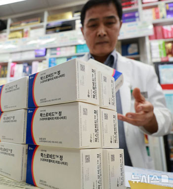 新型コロナが再流行して入院患者が急増している22日、ソウル市内のある薬局で、供給されたコロナ治療薬(パキロビッド、ラゲブリオ)を調べる薬剤師の様子。