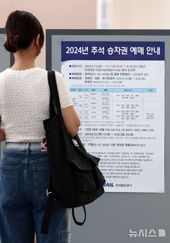 19日、ソウル駅待合室に張り出された2024年の秋夕(中秋節。今年は9月17日)の乗車券予約販売に関する案内文と、電光掲示板の案内文言。韓国鉄道公社(KORAIL)は「2024秋夕列車乗車券」の予約販..